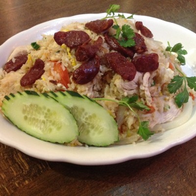 Chicken and Chinese sausage stir fried with rice, peas, carrots, onions and egg.